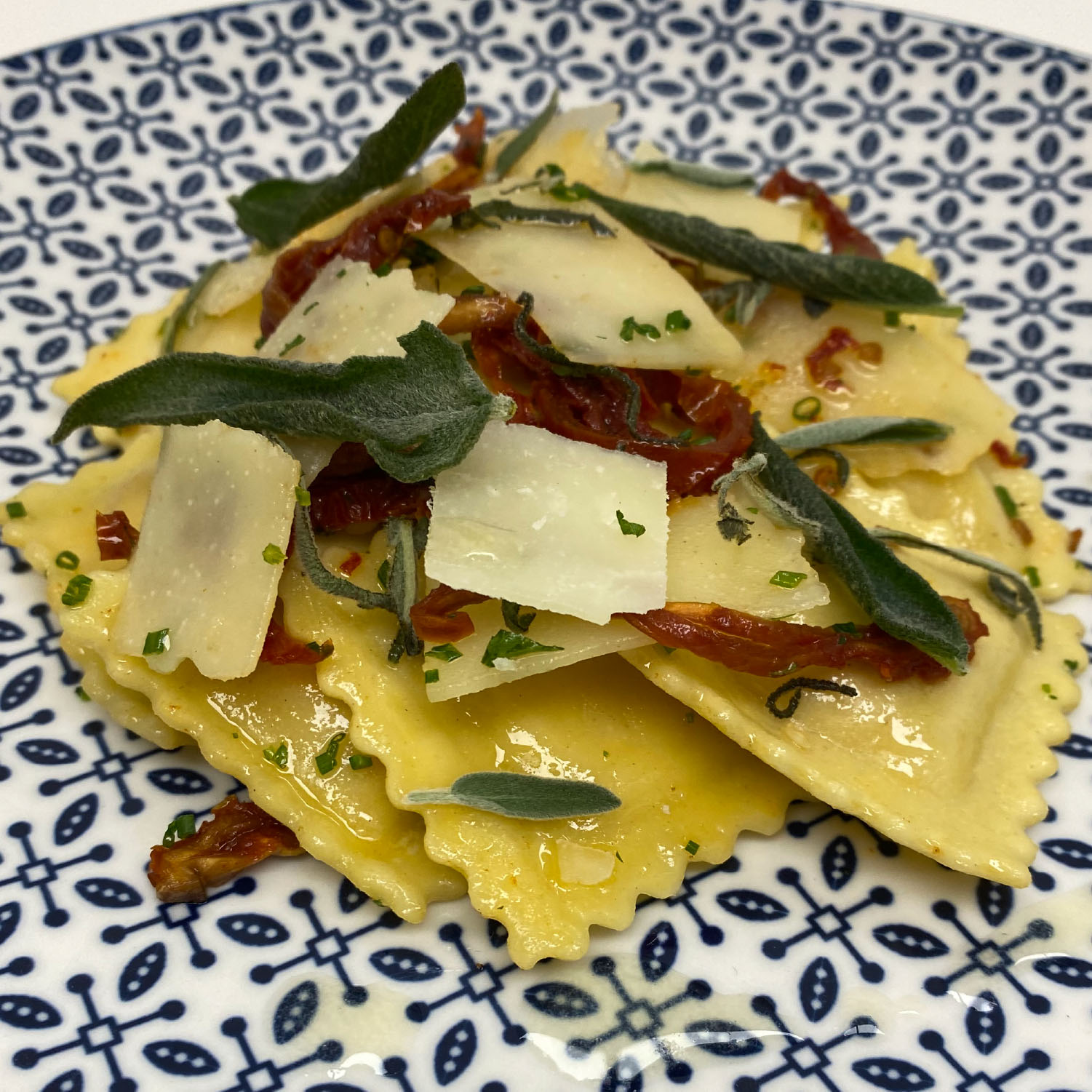 List of Ingredients: Pasta (enriched flour, enriched durum semolina, eggs, water), Cooked butternut squash, Ricotta cheese (pasteurized whey, pasteurized cream, salt, lactic acid, sodium bicarbonate), Toasted wheat breadcrumbs, Romano cheese (milk, bacterial culture, salt, lipase, calcium chloride, microbial enzyme, powdered cellulose), Parmesan cheese (milk, bacterial culture, salt, lipase, calcium chloride, microbial enzyme, powdered cellulose), Salt, White pepper, Nutmeg.